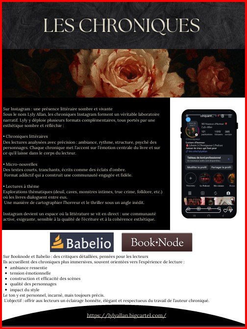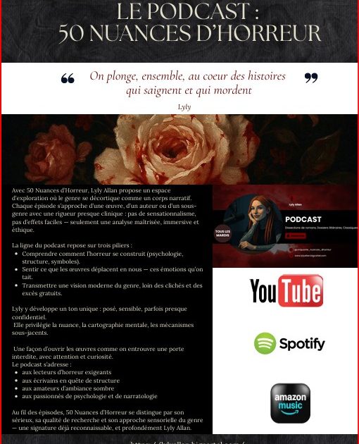 Vous souvenez-vous de cette interview de Lyly Allan, autrice de romans horrifiques, psychologiques, où il était également question de son podcast 50 nuances d’Horreur et de ses Chroniques, le tout sur fond de Metal Extrême ?