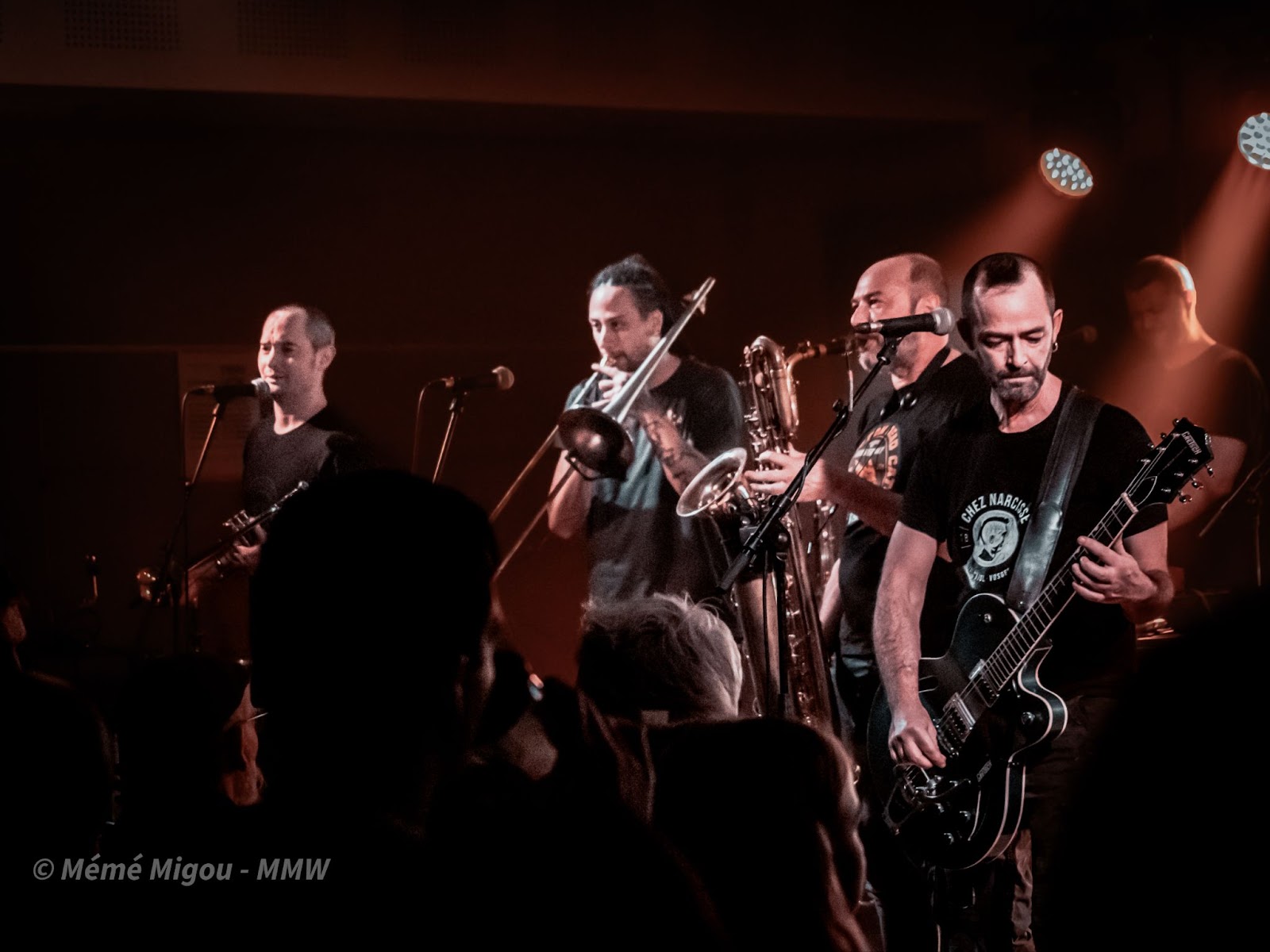 3 cuivres, mais avec la participation d’un quatrième de temps en temps : le chanteur des Coupe Gorge (cf Livre report de la part.1*) qui revient souffler dans un saxo sur un titre, et le chanteur-guitariste qui prend le trombone à coulisses.