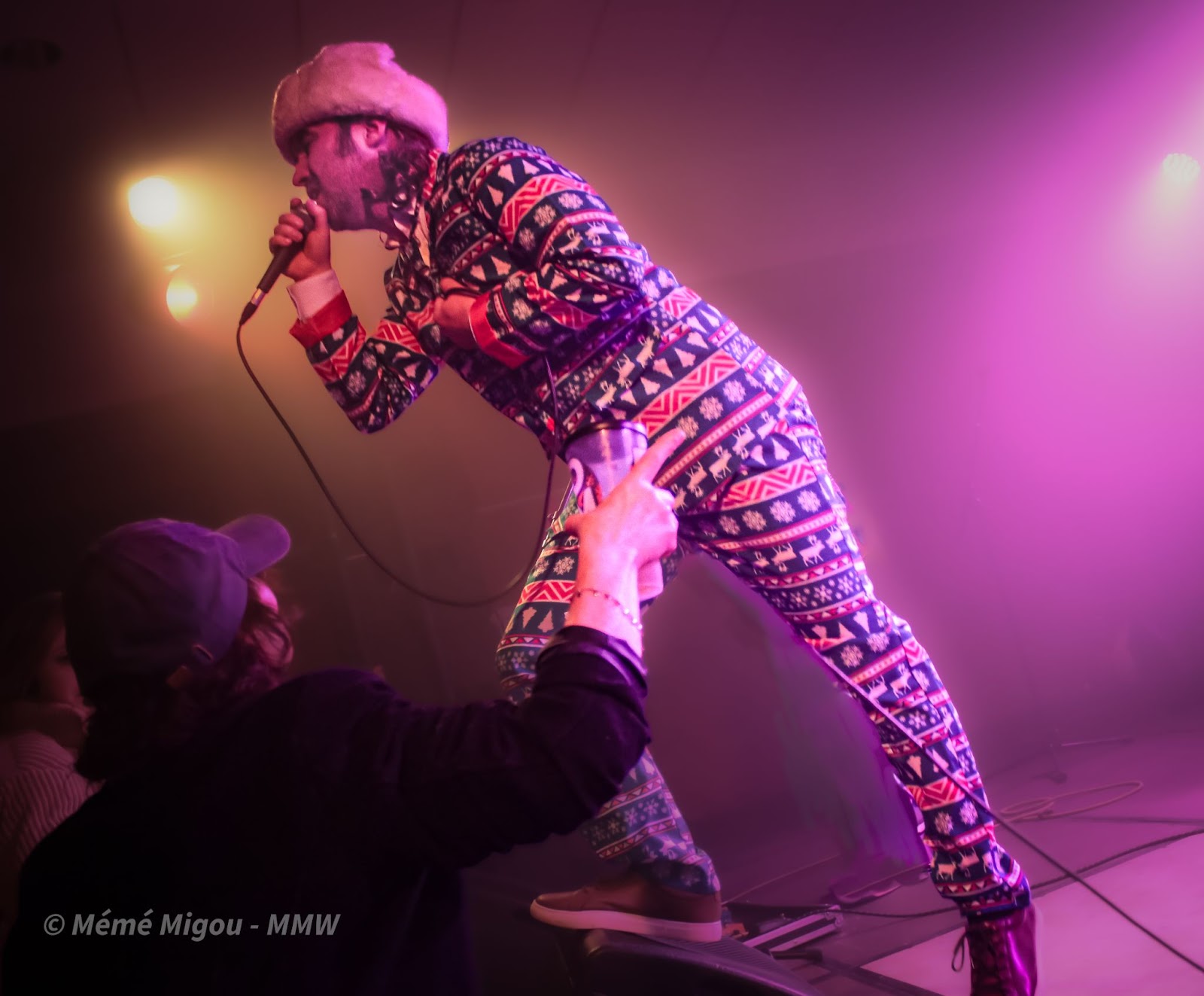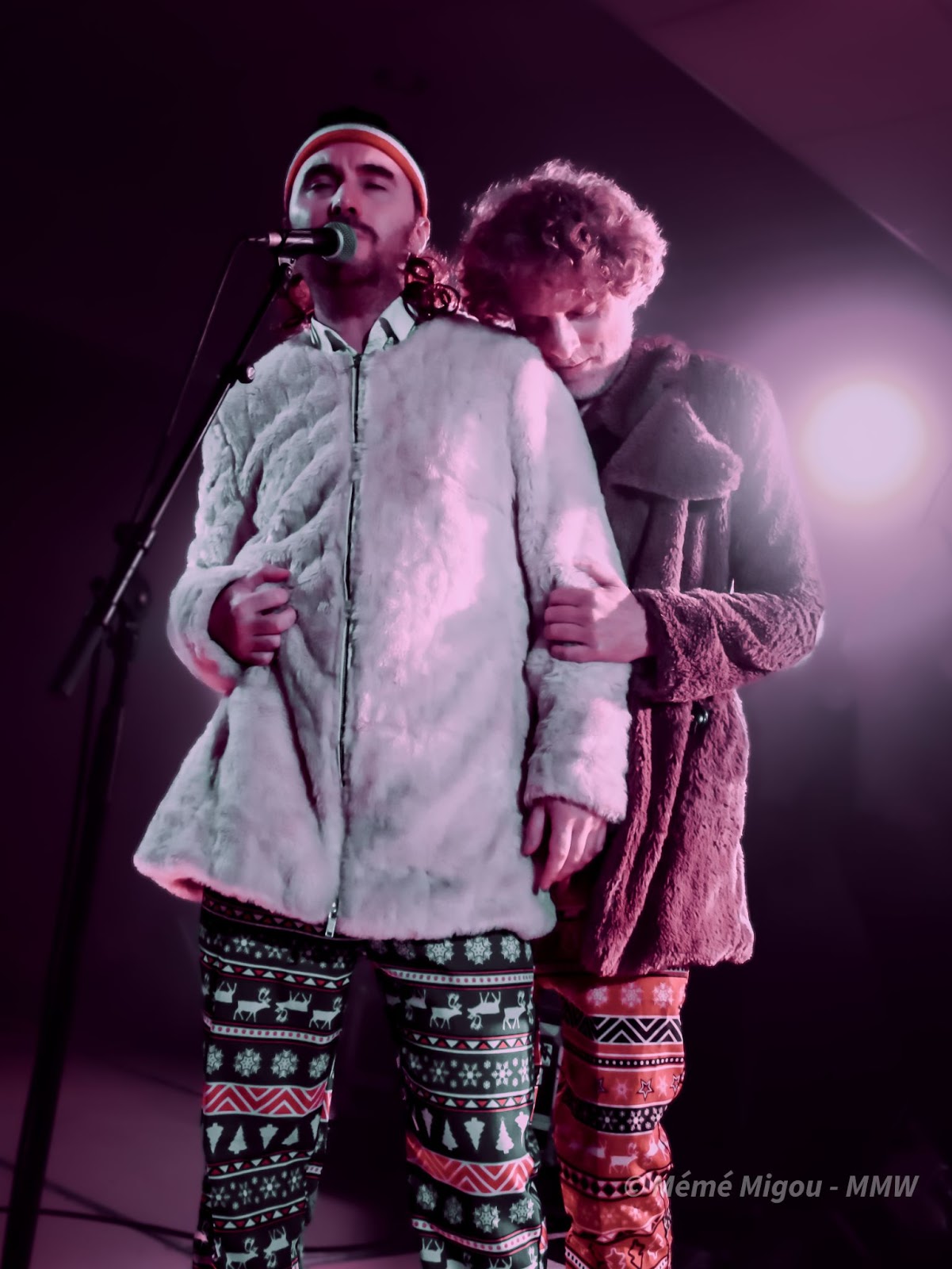 Pour commencer, l’entrée sur du Georges Mickaël (prononcé à l’anglaise) – Careless Whispers – avec des costumes dans une dominante de rose bonbon, des chapkas, et autres cerfs de Noël en déco. Okayyyy… Mais très vite, Georges Mickaël (prononcé à la française) lève le voile du pot-aux-roses (non ils n’ont pas viré leurs costumes-pyjamas à cerfs roses et sapins). Comme dans les derniers instants d’un épisode de Scoubidoubibdouuuuhouuuuuuu, ils nous avouent être Phil Collin. Enfin… Philippe Collin, comme son homophone le colin. C’est qu’ils nous donnent le Merlu… euh.. la berlue, ces quatre-là ! Et ils vont finir la soirée, finir le festival, en feu d’artifices !