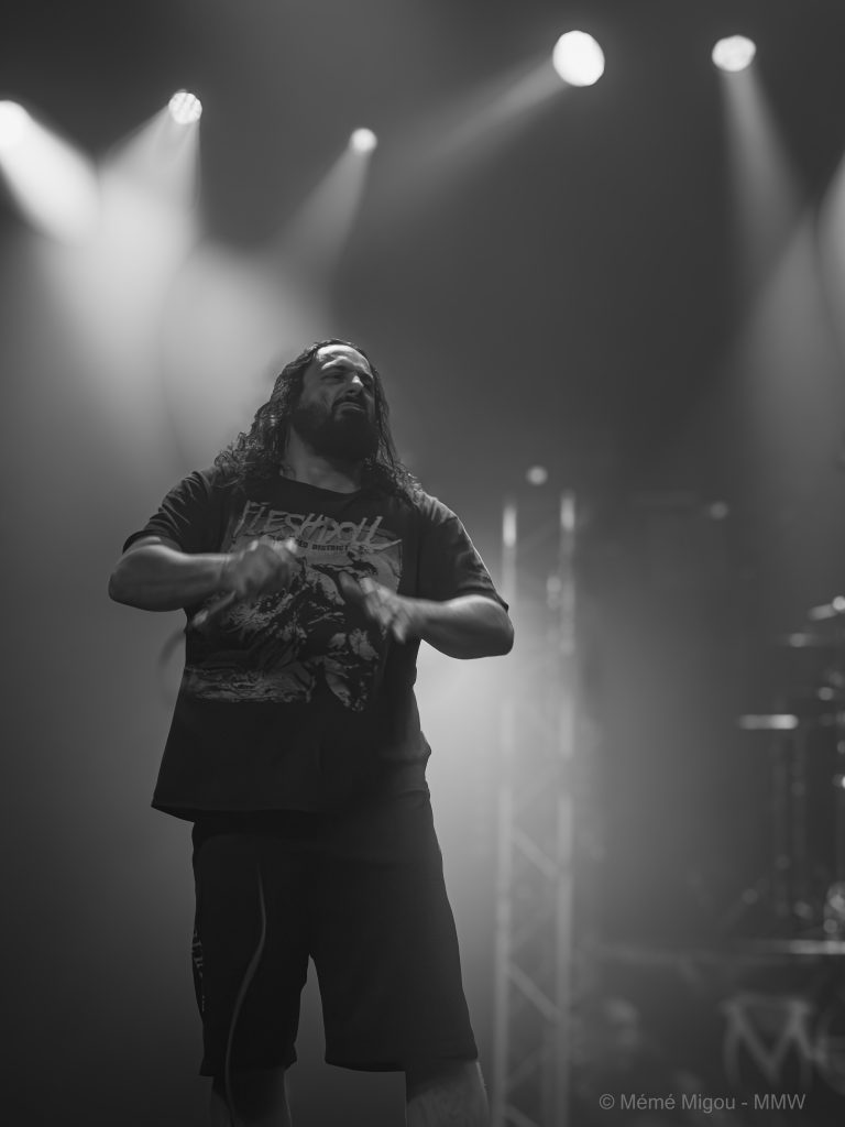 Mais voilà, en ce qui me concerne, je reste sur ma fin (et plus sur ma faim, si vous avez suivi, Mortuary a fait les frais de mes fringales)… Je m’explique : je n’ai absolument rien à reprocher à la qualité du show, du chant, des musiciens… rien… Si ce n’est un tout petit détail de rien du tout. Ayant justement vu Aborted un mois auparavant à Carhaix, je me suis étonnée d’avoir les mêmes vannes aux mêmes moments. Donc un show millimétré – ce qui n’est pas un mal en soi, mais bien du professionnalisme – jusque dans les moindres paroles. Et ça, ça me plaît beaucoup moins. Pourquoi ne pas rester nature et parler tout simplement au public. Là, on aurait un véritable échange. N’en demeure pas moins que c’était au poil de cul de fourmi près. Et le public ne s’y est pas trompé, il a répondu présent pour un pit chaud bouillant.